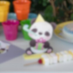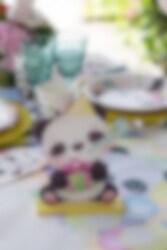 Supersöpö puinen pöytäkoriste, joka kuvaa juhlivaa pandaa. Koriste on valmistettu puusta, ja sen koko on 14 x 20 cm.