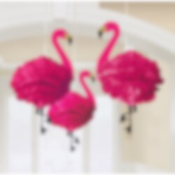 3 kpl hunajakennon mallisia roikkuvia koristeita, jotka esittävät majesteettisia flamingoja. Vaikuttava koriste synttäreille tai muihin juhliin. Koristeet ovat noin 49,5 cm kokoisia koottuina.