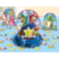 Hienot pöytäkoristeet Super Mario -teemalla. Koristele pöytä hienoksi Mario-synttäreille. Pakkaus sisältää yhden suuren koristeen (n. 32 cm korkea), kaksi pienempää (n. 18 cm) ja 20 kpl 5 cm läpimittaisia paperikonfetteja, jotka esittävät Mario-pelissä kerättäviä esineitä (power ups).