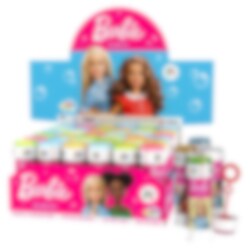 Saippuakuplat, joiden pullossa on värikkäitä kuvioita Barbie-teemalla. Saippuakuplat ovat suosittuja lahjoja lastenjuhlissa ja niitä on hauska puhaltaa yhdessä. Hinta on per kpl ja pullo sisältää 60 ml nestettä.