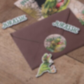 Pakkaus sisältää 4 tarra-arkkia, joista jokaisessa on neljä pyöreää tarraa. Tarroissa on tyrannosauruksen kuva ja teksti 'jurassic'. Hauska yllätys juhlapussiin!