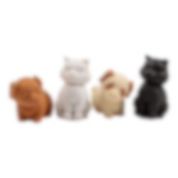 4 hauskaa pyyhekumia, jotka esittävät söpöjä koiria ja kissoja kauniissa väreissä. Kiva yllätys juhlapussiin. Koirat ovat noin 2,5 cm korkeita ja kissat noin 3,5 cm korkeita ja ne toimitetaan hienossa pienessä laatikossa.