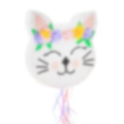 Kaunis kissan pään muotoinen pinata, joka on koristeltu kukilla. Pinata on hauska yllätys mihin tahansa juhliin ja se voidaan täyttää sekä makeisilla että pienillä leluilla. Pinatan mitat ovat noin 33 x 35 x 7,5 cm.