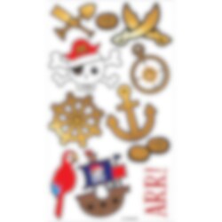 11 kpl erilaisia merirosvoaiheisia tatuointeja. Hauska lisä juhlapussiin tai piñatan täytteeksi.