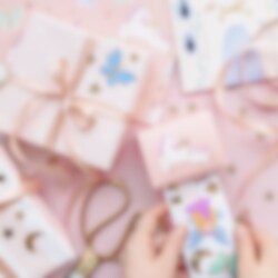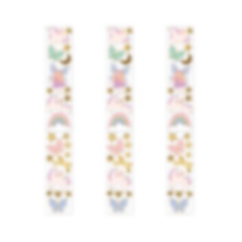23 kpl tarroja kauniilla yksisarvisaiheisilla kuvilla – 12 erilaista kuviota. Tarrat ovat kätevällä 126 cm pituisella rullalla.