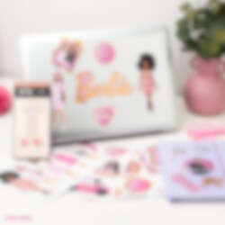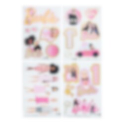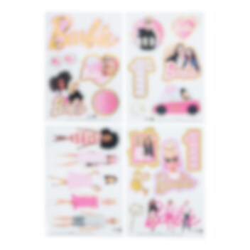 22 kpl. vedenkestäviä Barbie-teeman tarroja, jaettuna 4 arkkiin. Täydellinen tavaroiden koristeluun Barbie-silauksella.