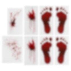 8 tarraa, joissa on verisiä jalanjälkiä ja veriroiskeita ja jotka voit kiinnittää lattialle tai ikkunoihin luomaan karmivan tunnelman Halloweeniin. Jokainen pakkaus sisältää: 4 veristä jalanjälkeä ja 4 eri muotoista veriroisketarraa. Jalanjäljet ovat 22 cm pitkiä ja veriroisketarrat ovat noin 19 cm pitkiä.