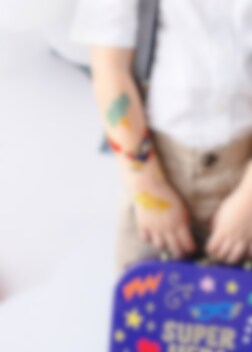 Poista kirkas kalvo tatuoinnin päältä ja aseta tatuointi ihoa vasten. Kostuta tatuoinnin takana oleva valkoinen paperi vedellä ja odota noin 30 sekuntia. Irrota paperi varovasti, jotta kuva siirtyy iholle. Tatuointi kuluu pois muutamassa päivässä. Voidaan poistaa iholta vauvaöljyllä.