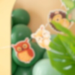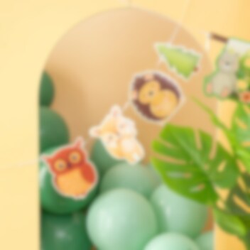 Koristeellinen pahvinen viirinauha, joka on koristeltu ihanilla metsäeläinkuvilla. Ihana metsäteemaisiin juhliin.
