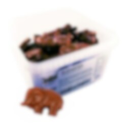 Suklaalla kuorrutettuja norsuja, joissa on mansikkavaahtoa sisällä. Myydään suurpakkauksessa, joka painaa 1 100 grammaa.