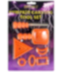 Setti, jonka avulla voit loihtia upean Halloween-kurpitsan. Anna mielikuvituksen lentää, kun haluat koristella kurpitsasi. Setti sisältää veitsen, lapion ja erilaisia muotteja. Kaikki osat on valmistettu kovasta muovista, veitsi on ruostumatonta terästä.
