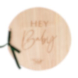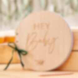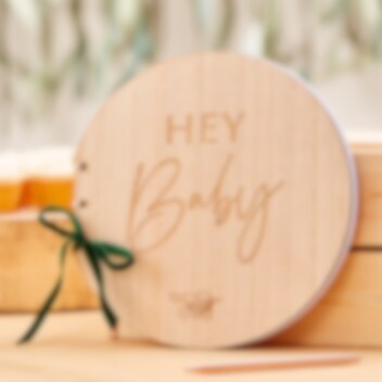 Pyöreä vieraskirja, joka on valmistettu puusta ja jossa on vihreä samettirusetti ja teksti ''Hey Baby''. Koostuu 32:sta tyhjästä sivusta ja on kooltaan noin 21 x 22 cm. Kirjaa voidaan käyttää niin kastajaisissa kuin vauvajuhlissa.