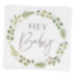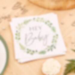 16 kpl ympäristöystävällisiä servettejä vihreän ja valkoisen värisinä, lehtikuvioilla sekä tekstillä ''Hey Baby''. Kaunis lisäys vauvajuhlien tai kastajaisten kattaukseen. Servetit ovat 2-kerroksisia ja kooltaa noin 33 x 33 cm.