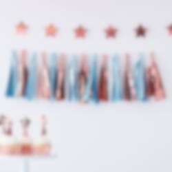 Tyylikäs viiri tupsuilla, vaaleansinistä ja ruusukultaa. Kaunis koriste Babyshowereille. Viirissä on 16 kpl tupsuja ja se on n. 1,5 m pitkä.