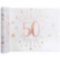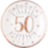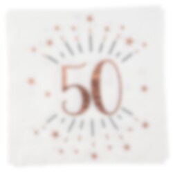 10 kpl valkoisia servettejä jossa on kimaltava, ruusukullanvärinen kuviointi ja numero 50. Nämä koristeelliset servetit sopivat täydellisesti 50-vuotisjuhliin.