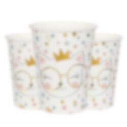 10 kpl suloisia pahvimukeja jossa on kuva kruunupäisestä kissasta värikkään konfetin ympäröimänä.
