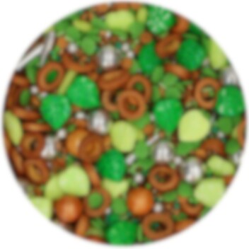 Anna leivonnaisillesi villi ja eksoottinen silaus tällä viidakkoteeman strösselimixillä! Jännittävä sekoitus vihreitä lehtiä, puunvärisiä renkaita ja hohtavia yksityiskohtia luo seikkailullisen koristelun kuppikakuille, kakuille ja muille herkuille. Täydellinen viidakkobileisiin ja teemaleivontaan.