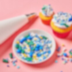 Leivonnaiset aitoon dinosaurusseikkailuun tällä leikkisällä strösselimixillä! Vihreät dinosaurukset, valkoiset luut ja värikkäät koristeet sinisen, keltaisen ja valkoisen sävyissä luovat jännittävän esihistoriallisen seikkailun tunteen kuppikakkuihin, kakkuihin ja muihin herkkuihin. Täydellinen pienille tutkimusmatkailijoille ja hauskoihin teemajuhliin.