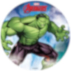 Cool ja värikäs kakkukuva vohvelia, kuvalla supersankari Hulk Avengerisin. Leivo persoonallinen kakku lastenjuhliin. Kakku on 20 cm halkaisijaltaan ja helppo käyttää. Vohvelikakkukuvat ovat gluteenittomia ja laktoosittomia eivätkä sisällä lisättyä sokeria.