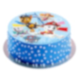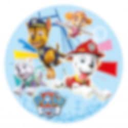 Värikäs kakkukuva sokerittomasta sokerimassasta. Kuva-aiheena Nickelodeonin TV-sarja Ryhmä Hau. Kakkukuva on valmis laitettavaksi kakun päälle. Kuvan halkaisija on noin 16 cm.