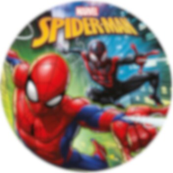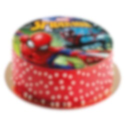 Värikäs kakkukuva sokerittomasta sokerimassasta. Kuva-aiheena Spiderman. Kakkukuva on valmis laitettavaksi kakun päälle ja kuva on terävämpi, kuin vohvelikakkukuvissa. Kuvan halkaisija on noin 20 cm.