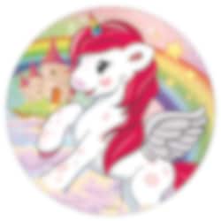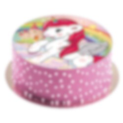 Kaunis kakkukuva sokerittomasta sokerimassasta. Kuva-aiheena suloinen yksisarvinen. Kakkukuva on valmis laitettavaksi kakun päälle ja terävämpi ja yksityiskohtaisempi kuin vohvelikuva. Kuvan halkaisija on noin 16 cm.