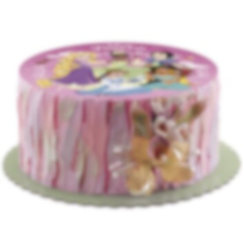 Kakkukuva sokerittomasta sokerimassasta. Kuva-aiheena Disney-prinsessat . Kakkukuva on valmis laitettavaksi kakun päälle. Kuvan halkaisija on noin 15,5 cm.
