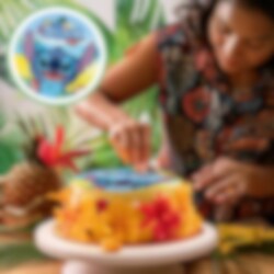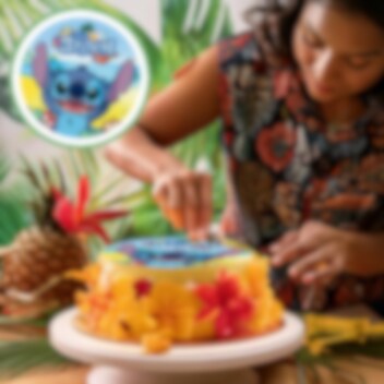 Sokerittomasta "sokeri"massasta valmistettu kakkukuva, jossa on todella söpö Stitch-kuvitus. Kakkukuva on valmis laitettavaksi kakun päälle. Painatus on terävämpi ja yksityiskohtaisempi kuin vohvelikuvassa. Lisäksi kuvassa on ihana vaniljan maku. Kuvan halkaisija on 20 cm