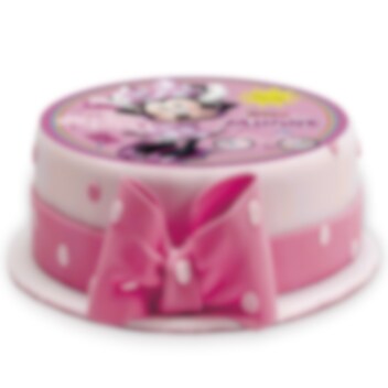 Kaunis kakkukuva sokerittomasta sokerimassasta. Kuva-aiheena keskellä Minni Hiiri. Kakkukuva on valmis laitettavaksi kakun päälle ja kuva on terävämpi kuin vohvelikakkukuvissa. Kuvan halkaisija on noin 15,5 cm.