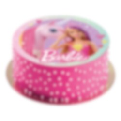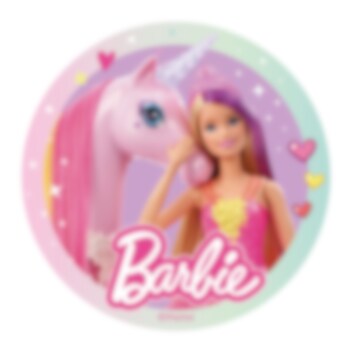 Vohvelista valmistettu kakkukuva, jossa on Barbie ja kaunis yksisarvinen. Leivo Barbie- teemainen juhlakakku ja aseta kuva sen päälle. Kuva on halkaisijaltaan 20 cm ja se on helppokäyttöinen. Kuva on gluteeniton ja laktoositon, eikä siihen ole lisätty sokeria.