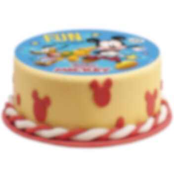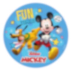 Kakkukuva maukkaasta sokerittomasta sokerimassasta. Kuvana Mikki Hiiri ja Pluto. Kakkukuva on valmis asetettavaksi suoraan kakun päälle ja sen kuva on terävämpi, kuin vohvelikuvassa. Kuvan halkaisija onnoin 15,5 cm.