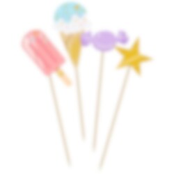 6 kpl cake toppers -koristeita, joissa on söpöjä jäätelö-, karamelli- ja tähtikuvioita. Kauniita koristeita kakkuihin ja muffinsseihin. Koristeet on valmistettu puusta ja paperista. Korkeus 16–22 cm.