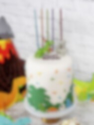 Raju kakunkoriste, joka esittää dinosaurusta ja jonka mukana on kyltti tekstillä 'Happy Birthday'. Dinosaurus on n. 9 cm korkea ja tekstikyltin mitat ovat 6 x 3 cm. Teksti on punaiselta.