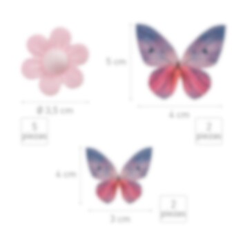 Luo kaunis ja elegantti kakku näillä kauniilla syötävillä vohvelikoristeilla! Setti sisältää 5 pientä kukkaa vaaleanpunaisen sävyissä sekä 4 perhosta punaisen ja violetin sävyissä – täydellisiä antamaan leivonnaisille luonnollisen ja hienostuneen ilmeen.