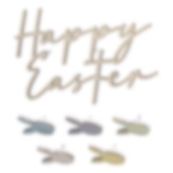 Lisää piste i:n päälle pääsiäisen viettoon tällä puisella "Happy Easter" kakkukoristeella. Kyltin lisäksi mukana tulee myös viisi söpöä puista kaninpäätä.