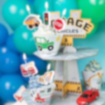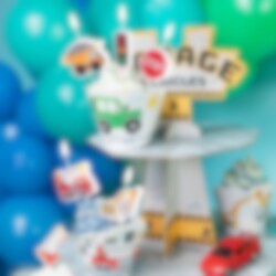 Kakkukynttilät, joissa on paloauto, kaivinkone, kippiauto, stop-merkki ja liikennevalot. Ne tekevät syntymäpäiväkakusta ekstrahauskan kaikille pienille ajoneuvofaneille. Kynttilät ovat 3-4 cm ja kiinnitetty käytännöllisiin puutikkuihin, jotta ne on helppo laittaa kakkuun.