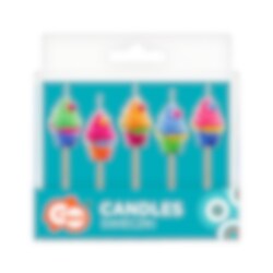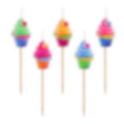 5 kakkukynttilää, joissa on värikkäitä kuppikakkujen kuvioita. Kynttilöiden koko on 4-8 cm.