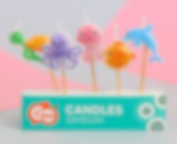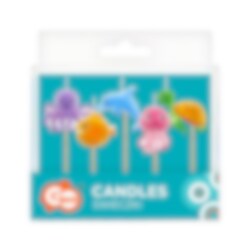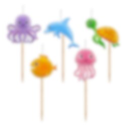 5 söpöä kakkukynttilää, joissa on mustekala, meduusa, kala, delfiini ja kilpikonna. Nämä kynttilät sopivat täydellisesti merenneito- tai meriaiheisiin juhliin. Kynttilät ovat kooltaan 4-8 cm.