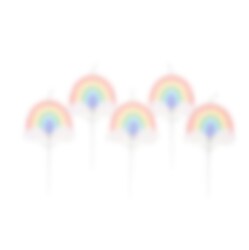 5 kakkukynttilää, joissa on pieniä pastellinsävyisiä sateenkaaria. Täydellinen koriste kaikkiin juhliin. Kynttilät ovat noin 5 cm korkeita.
