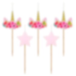 5 söpöä kakkukynttilää, joissa on yksisarvisen sarvia ja vaaleanpunaisia tähtiä. Nämä kynttilät sopivat täydellisesti yksisarviaiheisiin juhliin. Kakkukynttilöiden koko on 4-8 cm.