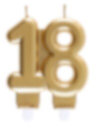 Kullanvärinen ja elegantti kakkukynttilä, joka on numeron 18 muotoinen. Kakkukynttilä on 7,5 x 9 cm kokoinen.