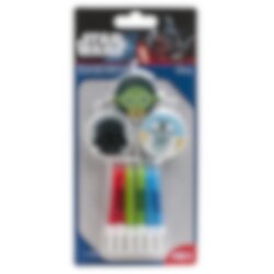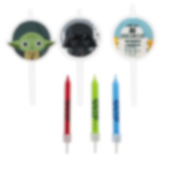 Piristä Star Wars -teemajuhlia näillä kakkukynttilöillä! Pakkaus sisältää 15 kynttilää, joissa on kuvioita ikonisesta elokuvasarjasta. 3 kakkukynttilää ovat pyöreitä ja niiden halkaisija on 3,5 cm.