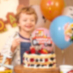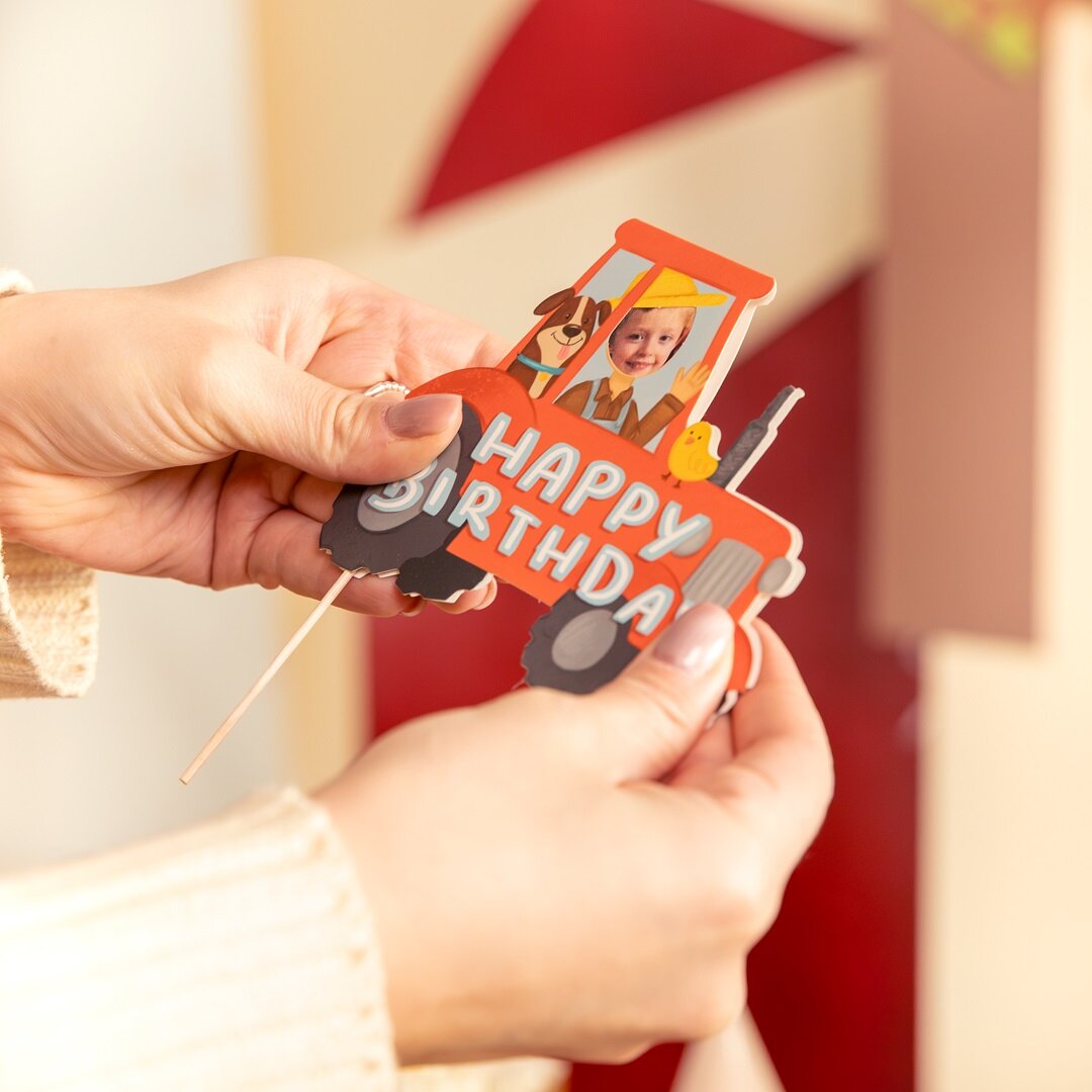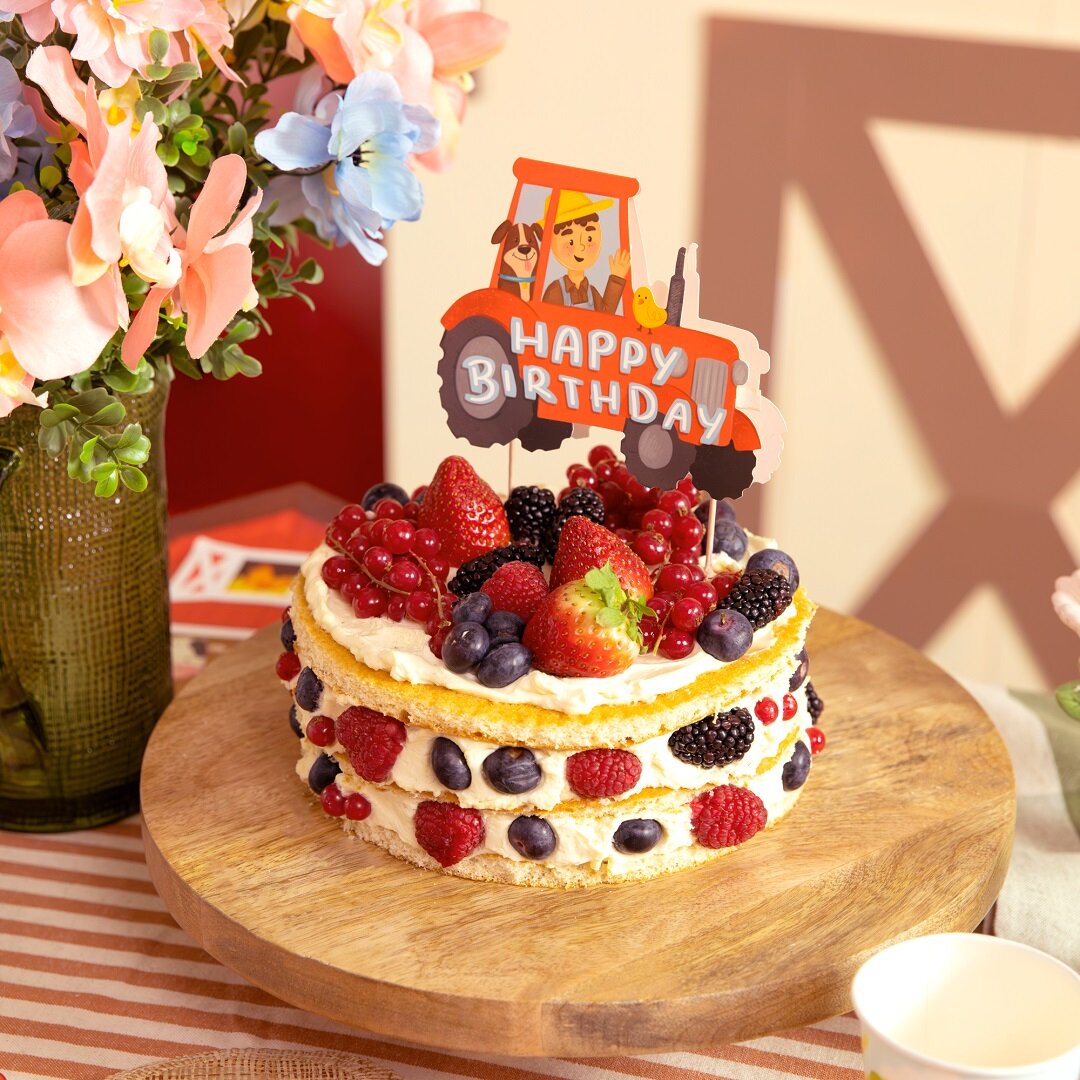 Traktorin muotoinen kakkukoriste on hauska ja persoonallinen yksityiskohta lasten synttärijuhlille. Koristeessa on teksti Happy Birthday ja kätevä aukko, johon voit laittaa oman valokuvasi, mikä tekee siitä erityisen sopivan maatila-aiheisiin synttärijuhliin.