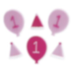 6 sokerikoristetta, jotka esittävät ilmapalloja ja hattuja vaaleanpunaisen sävyissä kuvalla numerosta ”1”. Erinomainen 1-vuotisjuhlien leivontaan.