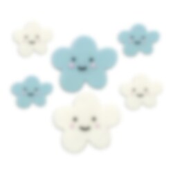 6 kpl sokerikoristeita, jotka esittävät hauskoja pilviä sinisen ja valkoisen väreissä. Ihania kakun koristeluun ennen synttäreitä.