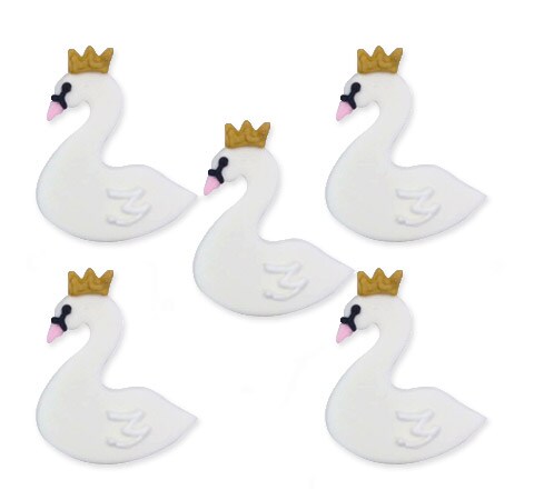 5 kpl sokerikoristeita, jotka esittävät valkoisia joutsenia. Hauska lisä kakun koristeluun ennen joutsenteemaisia synttäreitä.