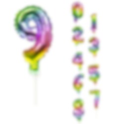 Foliopallot sateenkaarenväreissä, jotka voit asettaa kakun tai muiden leivonnaisten päälle juhlissa tai synttäreillä. Pallot ovat noin 13 cm korkeita ja kiinni muovitikussa. Yhdistä miten haluat, sillä ilmapallot ovat saatavilla numeroissa 0-9. Hinta on yhdelle pallolle. Lue ohjeet pakkauksesta.