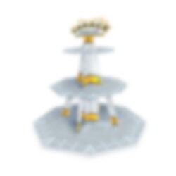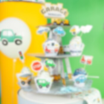Luo hauska tunnelma tällä muffinssitelineellä, joka esittää autotallia. Se sopii muun muassa täydellisesti ajoneuvoteemaisiin juhliin. Se on valmistettu tukevasta pahvista, jonka koko on 46 x 34 cm.