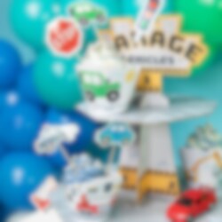 8 kpl. cake topperseja erilaisilla värikkäillä ajoneuvoilla, liikennevaloilla ja tienviitoilla. Täydellisiä kakkujen ja leivonnaisten koristeluun ajoneuvoteeman lastenjuhliin! Ne ovat noin 9 cm korkeita ja ne on valmistettu paperista ja puusta.