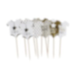 12 kpl valkoisia ja kultaisia folioituja koristetikkuja Babyshower-teemalla. Koristele leivonnaiset näillä Babyshower-juhliin. Koristetikut ovat noin 10 cm korkeita.